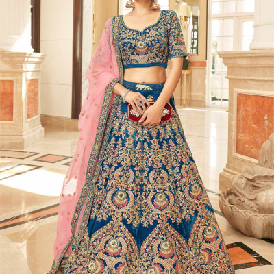 Gorgeous Teal Blue Embroidered Velvet Bridal Wear Lehenga Choli