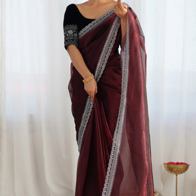 Astonishing Wine Sequins Net Function Wear Saree With Blouse