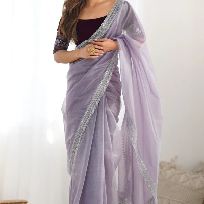 Incredible Lavender Border Work Net Reception Wear Saree With Blouse